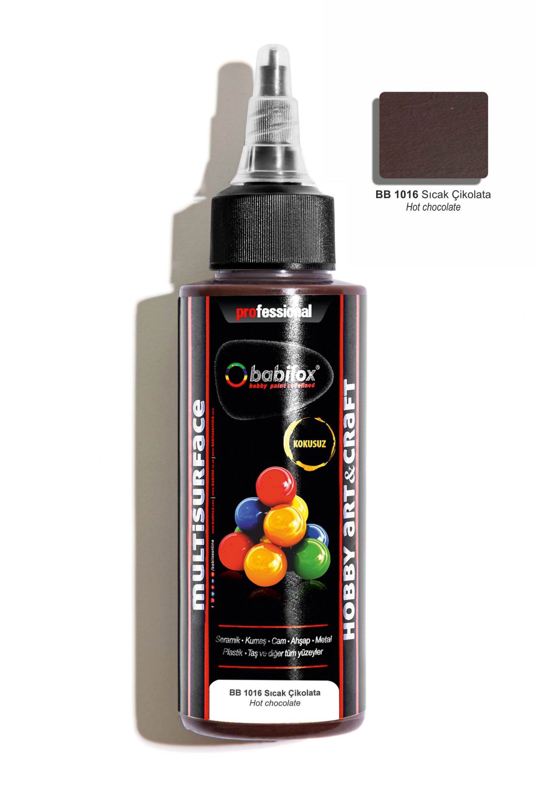 Babilox Multisurface (Akrilik) hobi boyası, sanatsal ve dekorasyonda kullanılan su bazlı zanaat ve sanat boyasıdır. Bu yelpazedeki canlı renkler dayanıklı, pürüzsüz yüzey, güvenli ve kullanımı kolay olduğundan, gelecek vadeden zanaatkarlar ile sanatçılar için mükemmeldir. Yumuşak ve sert tüm ahşap yüzeyler, kapı, pencere, ahşap bahçe mobilyaları ve diğer ahşap malzemelerde tuval, canvas pad, kağıt tabakalar, metal, porselen, seramik, polyester ve cam yüzeylerde dekoratif amaçla kullanılır.