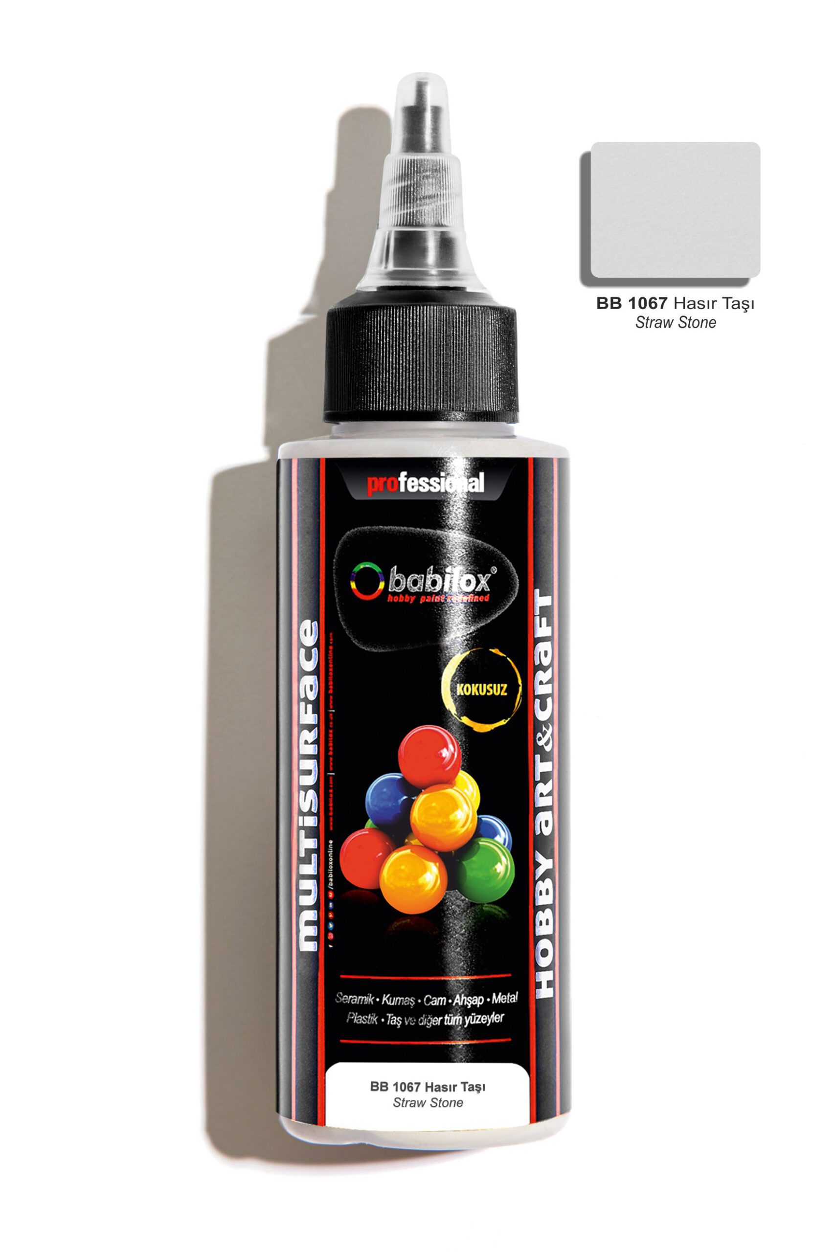 Babilox Multisurface (Akrilik) hobi boyası, sanatsal ve dekorasyonda kullanılan su bazlı zanaat ve sanat boyasıdır. Bu yelpazedeki canlı renkler dayanıklı, pürüzsüz yüzey, güvenli ve kullanımı kolay olduğundan, gelecek vadeden zanaatkarlar ile sanatçılar için mükemmeldir. Yumuşak ve sert tüm ahşap yüzeyler, kapı, pencere, ahşap bahçe mobilyaları ve diğer ahşap malzemelerde tuval, canvas pad, kağıt tabakalar, metal, porselen, seramik, polyester ve cam yüzeylerde dekoratif amaçla kullanılır.