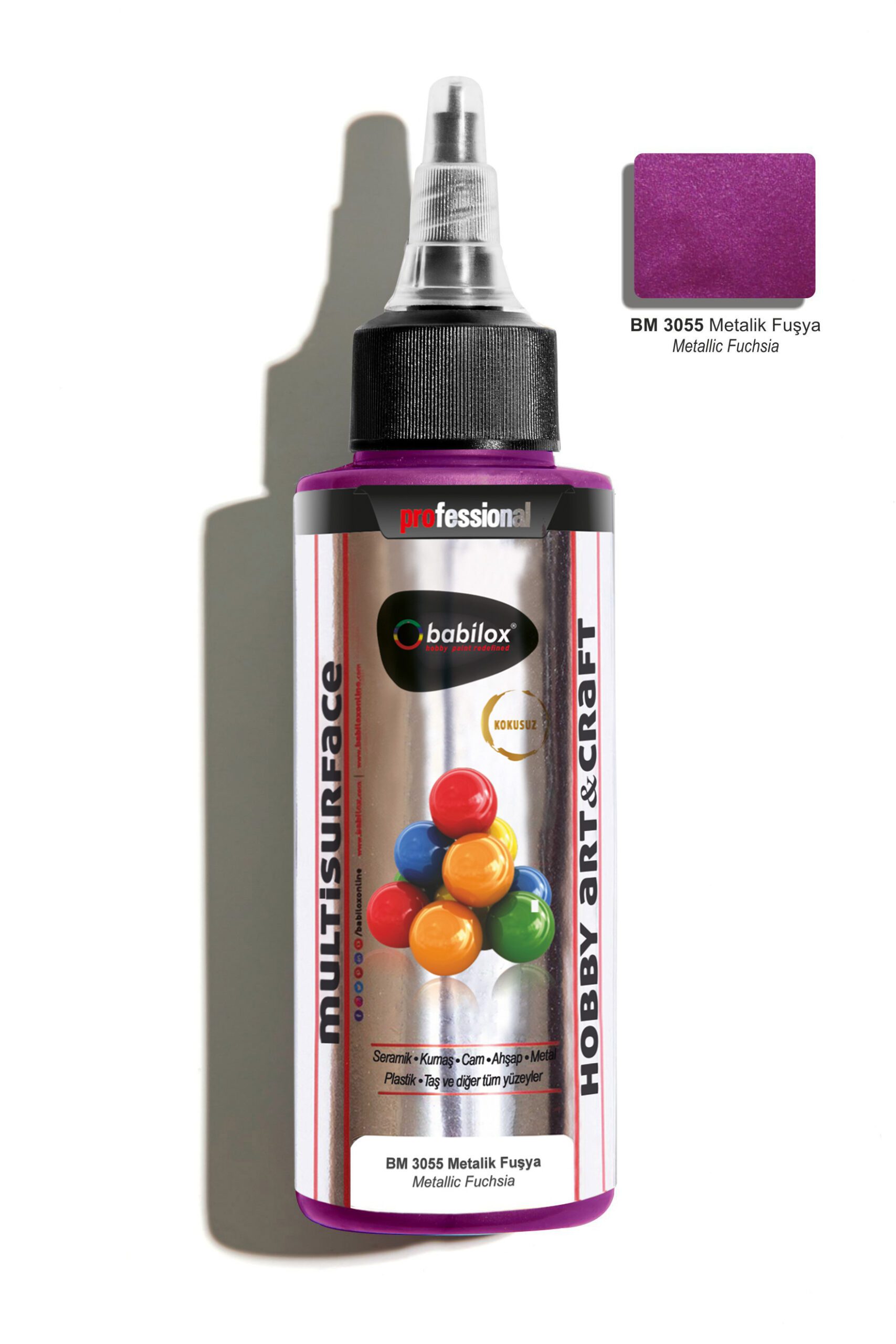 Babilox Multisurface (Metalik) hobi boyası, sanatsal ve dekorasyonda kullanılan metalik görünüm sağlayan su bazlı zanaat ve sanat boyasıdır. Bu yelpazedeki canlı renkler dayanıklı, pürüzsüz yüzey, güvenli ve kullanımı kolay olduğundan, gelecek vadeden zanaatkarlar ile sanatçılar için mükemmeldir. Yumuşak ve sert tüm ahşap yüzeyler, kapı, pencere, ahşap bahçe mobilyaları ve diğer ahşap malzemelerde tuval, canvas pad, kağıt tabakalar, metal, porselen, seramik, polyester ve cam yüzeylerde dekoratif amaçla kullanılır.